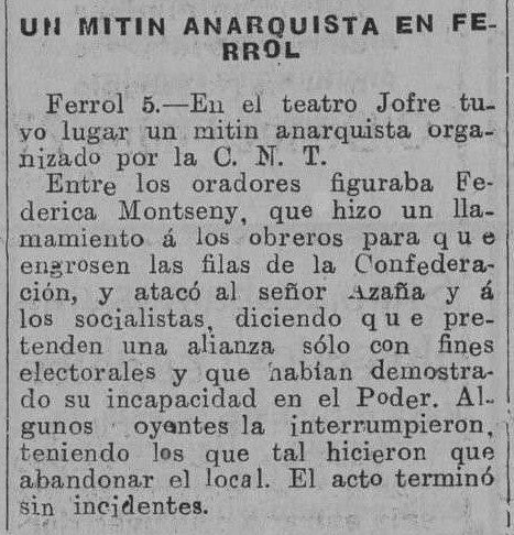 Tamén a prensa madrileña da época fíxose eco do mitin da CNT no Teatro Jofre de Ferrol coa presencia de Federica Montseny: