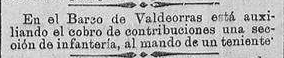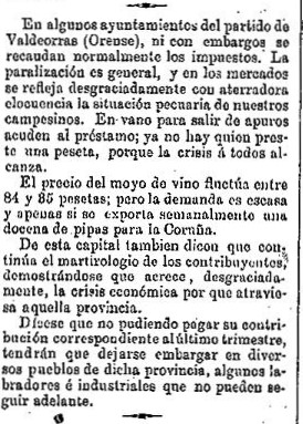 Tamén o semanario Follas Novas faise eco da chegada a Valdeorras de novos axentes (delegados de apremio) que acompañados de forzas represivas estarán encargados de facer efectivo o cobro dos tributos: