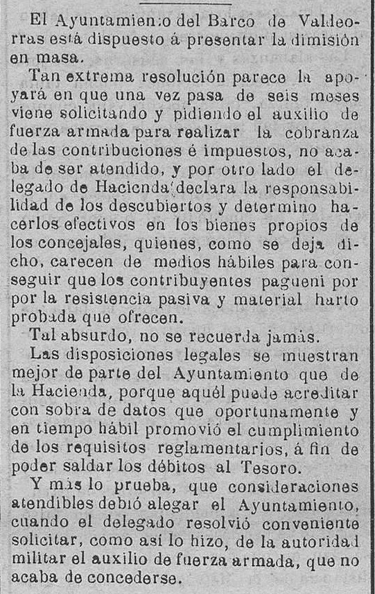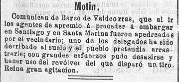 Ao ano seguinte, a totalidade da corporación municipal de O Barco amenaza con presentar a súa dimisión de non recibir tropas para vencer a resistencia do pobo e lograr cobrar o imposto, como recolle o xornal El Eco de Santiago, no seu exemplar de 23 de decembro de 1896: