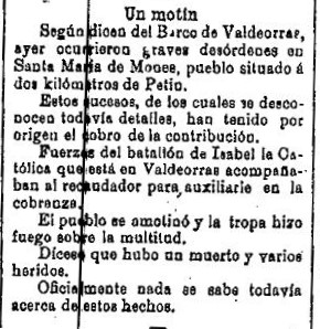 De feito, no ano 1892, prodúcese un motín na propia cidade de Ourense, que será obxecto dunha entrada propia este espazo web, que aparece así recollida na prensa: