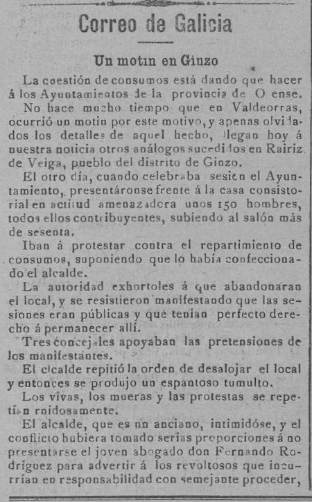Como temos visto en anteriores entradas de Memoria Libertaria na Galiza (ver as entradas “O “Motín dos Consumos”, na Coruña, en 1886” neste mesmo espazo web), as protestas e motíns contra este imposto foron desenvolvéndose en moitas cidades e vilas galegas. Por exemplo, en 1891, en Rairiz de Veiga, preto de Xinzo de Limia, como recolle o xornal La Monarquía, no seu exemplar de 5 de decembro de 1891: