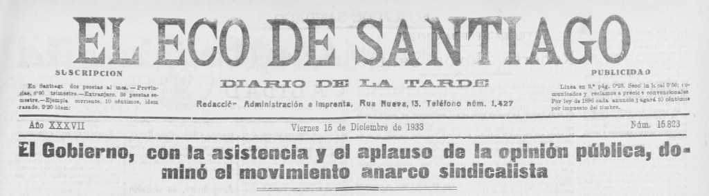 Los días de la pasada revuelta anarcosindicalista han transcurrido aquí sin la menor novedad ni alteración de ningún género. Solamente se han notado sus efectos en la carencia de prensa (salvo algún periódico madrileño que venía por la línea de Curtis y Santiago y que además de la radio ha servido de única fuente de información), y en la paralización de la línea de autos que nos comunica diariamente con la capital de la provincia, uno de cuyo conductores se dice haber sido detenido por formar parte de la directiva de la C.N.T.