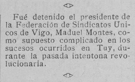 Vigo, 20.- Esta tarde fue detenido Manuel Montes, presidente de la Federación de Sindicatos Únicos de Vigo, como supuesto complicado en los sucesos ocurridos en Tuy durante la pasada intentona revolucionaria.