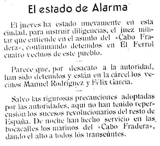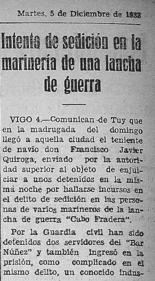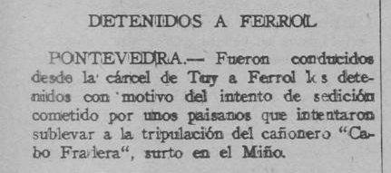 Salientable, como vemos, o intento de sublevar un buque militar, o “Cabo Fradera”, fondeado no río Miño en Tui que é recollido na prensa nos días previos á insurrección. Logo da súa detención, os acusados destes feitos foron trasladados a prisións militares da Armada en Ferrol.