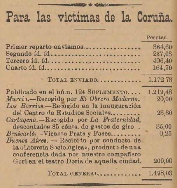 Los anarquistas sabíamos que de cien presos, sólo cuatro ó cinco eran libertarios; sin embargo, para todos procuramos y á todos socorrimos y socorremos aunque se hubiese encontrado entre ellos ese Rodríguez que ha empleado su actividad en restar simpatías y dinero á los detenidos, y ha falseado los hechos desarrollados en la Coruña por odio á los anarquistas, para hundirlos en los presidios al objeto de poder dirigir á los óbreros coruñeses por el camino de las elecciones, por medio de las cuales espera ser personaje aquel infeliz, sin que tuviera la delicadeza de pensar que la inmensa mayoría de los presos no eran libertarios.