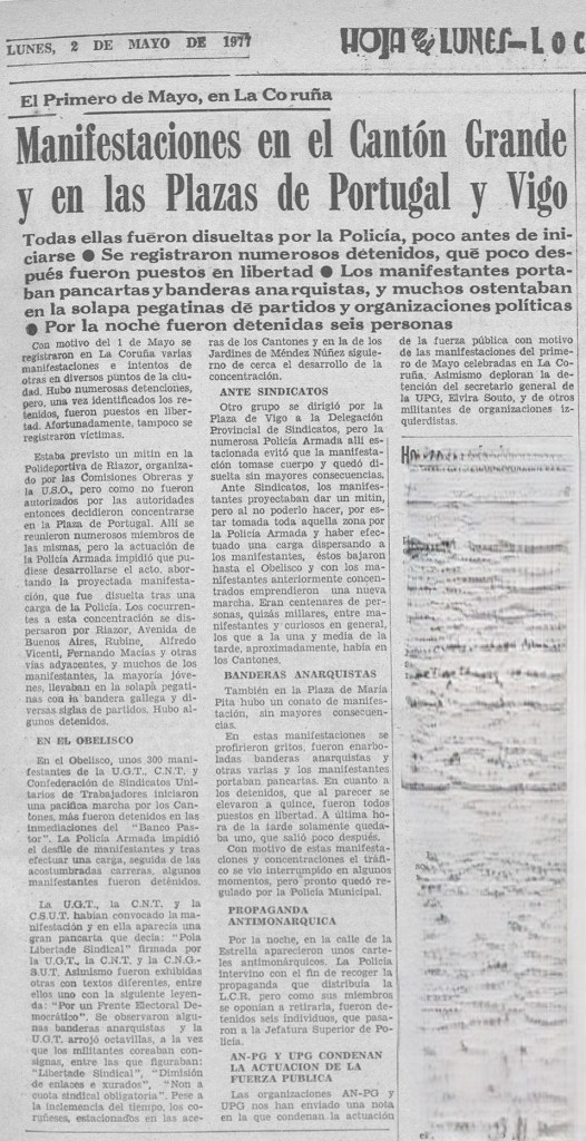 Outro xornal coruñés da época, Hoja Oficial del Lunes, editado pola Asociación da Prensa da cidade, no seu exemplar do 2 de maio de 1977, publica o seguinte: