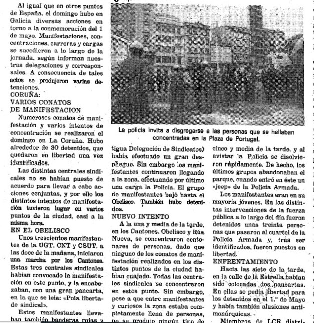 Con motivo del 1 de Mayo se registraron en La Coruña varias manifestaciones e intentos de otras en diversos puntos de la ciudad. Hubo numerosas detenciones, pero, una vez identificados los retenidos, fueron puestos en libertad. Afortunadamente, tampoco se registraron víctimas.