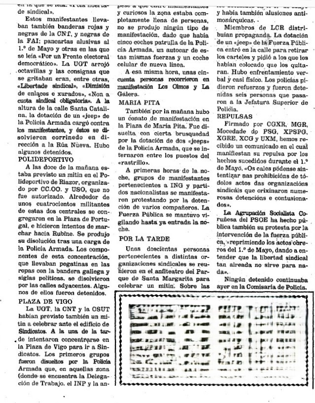 Estos manifestantes llevaban también banderas rojas y negras de la CNT, y negras de la FAI; pancartas alusivas al 1º de Mayo y otras en las que se leía: “Por un Frente electoral democrático”. La UGT arrojó octavillas y las consignas que se gritaban eran, entre otras, “Liberdade sindical”, Dimisión de enlaces e xurados”, “Non á cuota sindical obligatoria”. A la altura de la calle de Santa Catalina, la dotación de un “jeep” de la Policía Armada cargó contra los manifestantes, y éstos se disolvieron corriendo en dirección a la Rúa Nueva. Hubo algunos detenidos.