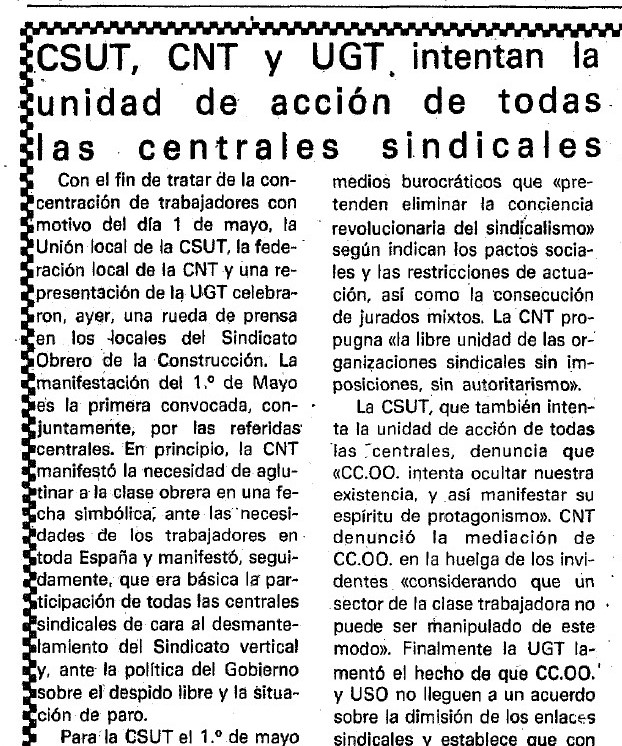 Ao día seguinte, celébrase unha rolda de prensa conxunta das organizacións sindicais CNT, UGT e CSUT que o xornal coruñés La Voz de Galicia recolle do seguinte xeito no mesmo exemplar de 3 de maio de 1977: