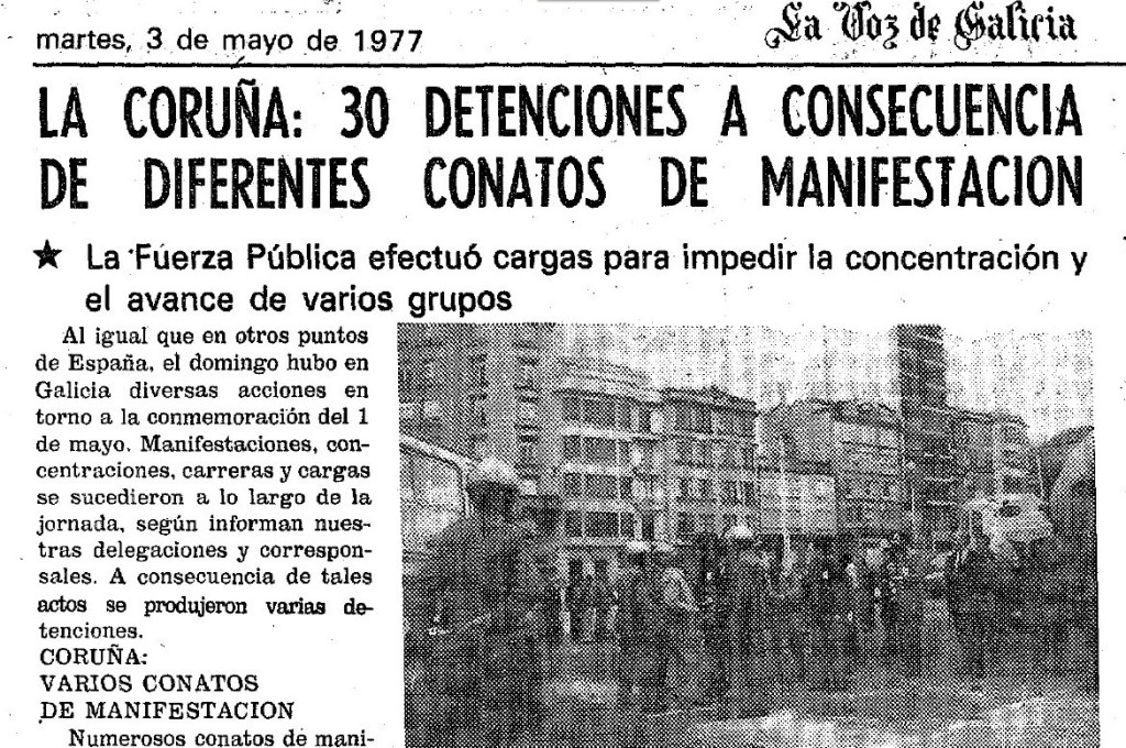 Pese á prohibición e unha grande presencia policial nas rúas da cidade para evitar a súa celebración, centos de militantes das diferentes organización sindicais realizan intentos de levar a cabo algúns os actos anunciados para aquel 1º de maio, e así o recolle o xornal coruñés La Voz de Galicia do 3 de maio de 1977: