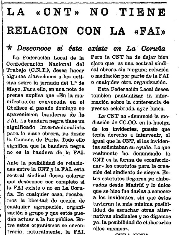Ante la posibilidad de relaciones entre la CNT y la FAI, esta central sindical desea aclarar que desconoce por completo si la FAI existe o no en La Coruña. En cualquier caso, recabamos la libertad de acción de cualquier agrupación, organización o grupo y que estos puedan actuar a la luz pública. Entre estos organismos se encontraría, naturalmente, la FAI.