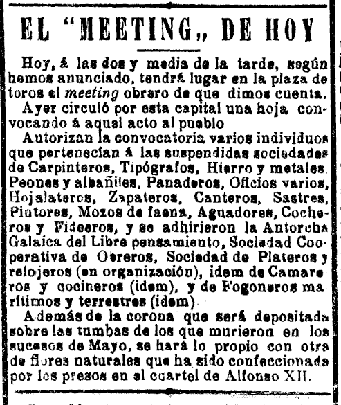 Autorizan la convocatoria varios individuos que pertenecían a las suspendidas sociedades de Carpinteros, Tipógrafos, Hierros y metales, Peones y albañiles, Panaderos, Oficios varios, Hojalateros, Zapateros, Canteros, Sastres, Pintores, Mozos de faena, Aguadores, Cocheros y Fideeros, y se adhirieron la Antorcha Galaica del Libre pensamiento, Sociedad Cooperativa de Obreros, Sociedad de Plateros y relojeros (en organización), idem de Camareros y cocineros (idem), y de Fogoneros marítimos y terrestres (idem).
