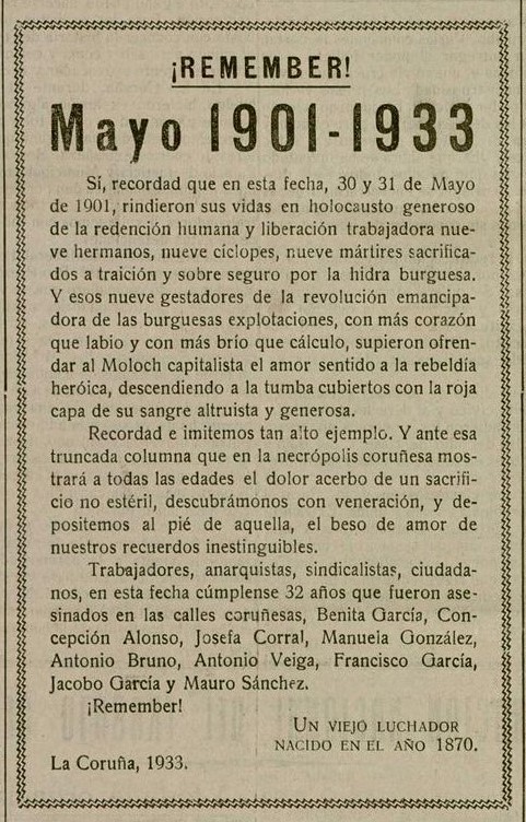 Trabajadores, anarquistas, sindicalistas, ciudadano, en esta fecha cúmplanse 32 años que fueron asesinados en las calles coruñesas Benita García, Concepción Alonso, Josefa Corral, Manuela González, Antonio Bruno, Antonio Veiga, Francisco García, Jacobo García y Mauro Sánchez.