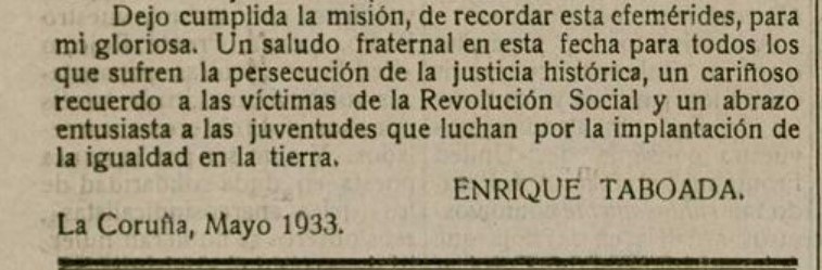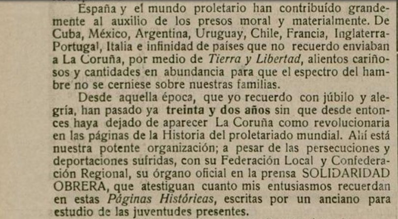Desde aquella época, que yo recuerdo con júbilo y alegría, han pasado ya treinta y dos años sin que desde entonces haya dejado de aparecer La Coruña como revolucionaria en las páginas de la Historia del proletariado mundial. Ahí está nuestra potente organización, a pesar de las persecuciones y deportaciones sufridas, con su Federación Local y Confederación Regional, su órgano oficial de prensa SOLIDARIDAD OBRERA, que atestiguan cuanto mis entusiasmos recuerdan en estas Páginas Históricas, escritas por un anciano para estudio de las juventudes presentes.