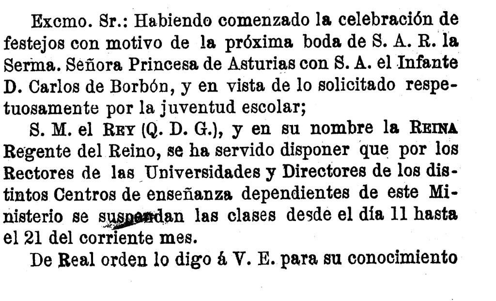 Excmo. Sr.: Habiendo comenzado la celebración de festejos con motivo de la próxima boda de S. A. R. la Serma. Señora Princesa de Asturias con S.A. el Infante D. Carlos de Borbón, y en vista de lo solicitado respetuosamente por la juventud escolar; S. M. el Rey (Q.D.G.), y en su nombre la Reina Regente del Reino, se ha servido disponer que por los Rectores de las Universidades y Directores de los distintos Centros de enseñanza dependientes de este Ministerio se suspendan las clases desde el día 11 hasta el 21 del corriente mes.