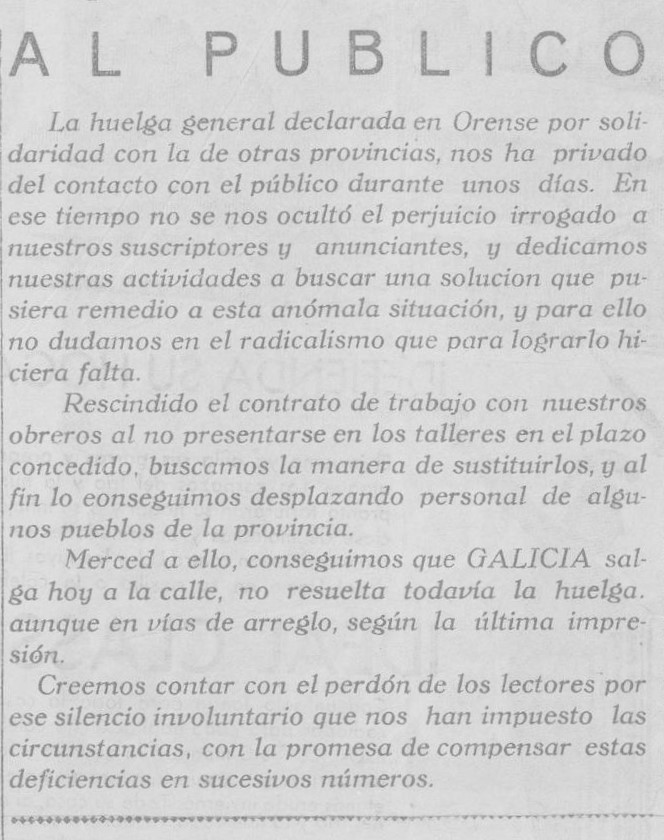 O día 9 de outubro de 1934, mediante a actuación de crebafolgas, o xornal Galicia de clara orientación conservadora e de liña editorial moi próxima á liña política de Calvo Sotelo, consegue saír do prelo antes de finalizar a folga, como recoñece en portada: