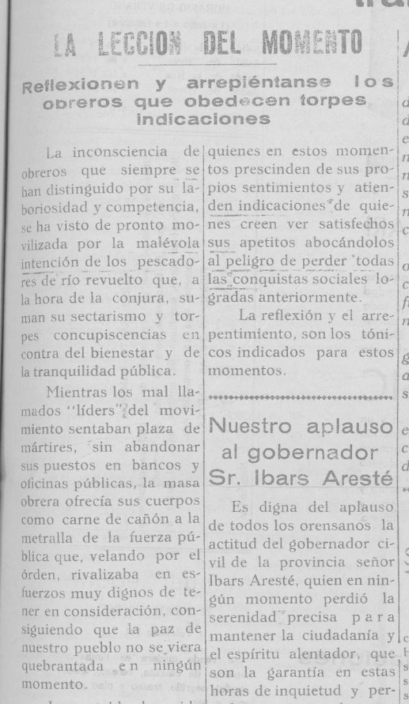 En lugar destacado na portada dese exemplar de 9 de outubro de 1934 do xornal Galicia aparecen as loubanzas ao Gobernador Civil e as críticas aos militantes e dirixentes obreiros: