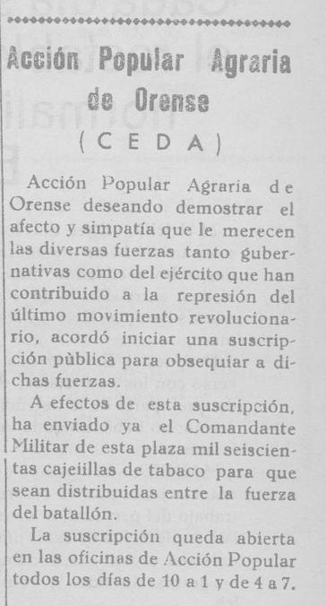 Por suposto, dada a súa liña editorial (non moi diferente da de outros xornais dos que falamos nesta entrada), nos citados números do xornal Galicia de 9 e 11 de outubro de 1934 faise ampla difusión da reacción dereitista ao movemento folguístico do proletariado, nomeadamente da Acción Popular Agraria, adherida á CEDA (Confederación Española de Derechas Autónomas):