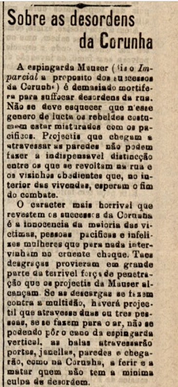 O día 7 de xuño de 1901, o mesmo Diario Illustrado de Lisboa recolle o plantexado polo xornal madrileño El Imparcial (como veíamos na entrada correspondente deste mesmo espazo web) ao respecto do uso de armas de guerra (o fusil Maüser) contra a poboación civil: