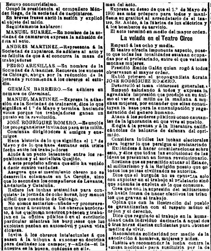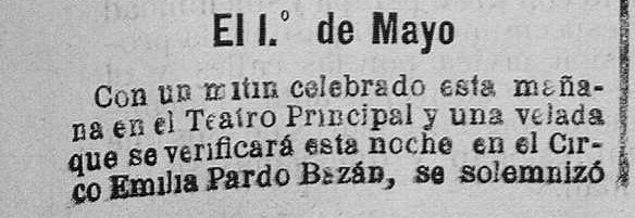 Hai 120 anos, a clase obreira coruñesa conmemoraba o 1º de maio cun mitin celebrado pola mañá no Teatro Principal (desde 1909 coa denominación actual de Teatro Rosalía de Castro) e unha velada pola tarde no Teatro Circo Emilia Pardo Bazán, que estaba construido na Marina.