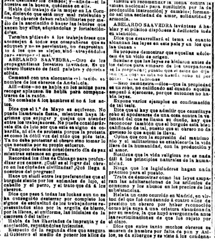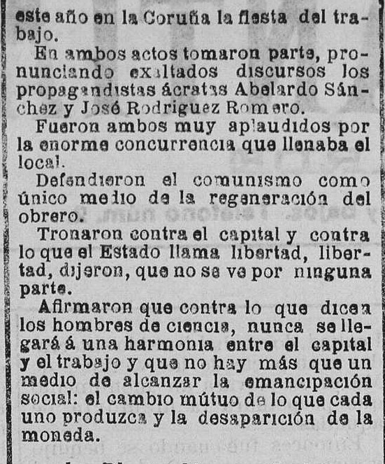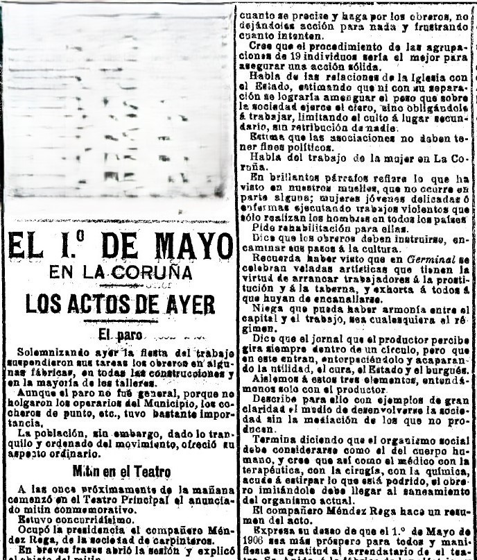 Tamén o xornal de Compostela, El Eco de Santiago recolleu no seu exemplar de 2 de maio de 1905, unha brevísima crónica do acto obreiro na Coruña: