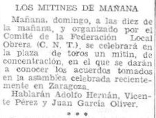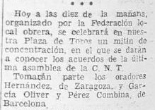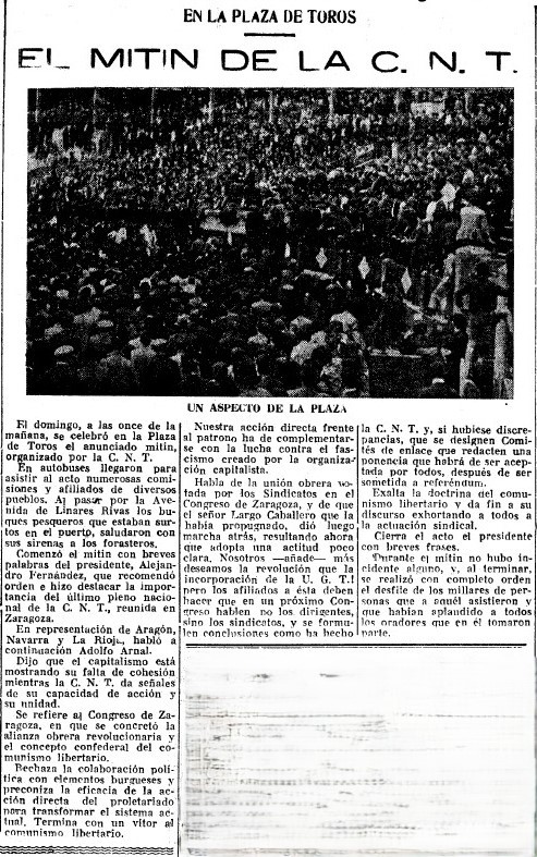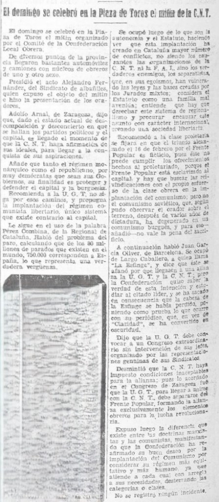 El domingo, a las once de la mañana, se celebró en la Plaza de Toros el anunciado mitin, organizado por la C.N.T.