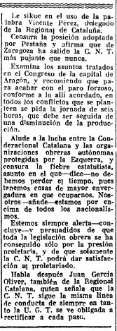 Habla después Juan García Oliver, también de la Regional Catalana, quien señala que la C.N.T. sigue la misma línea de conducta de siempre, en tanto la U.G.T. se ve obligada a rectificar a cada paso.