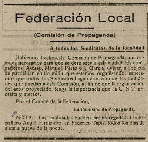 No nos detenemos ya mucho más. Estamos cansados, no solamente por el viaje realizado desde ayer hasta aquí, sin parar un solo momento; la atmósfera contribuye mucho a que uno se fatigue y llegue un momento, como ahora, en que con las frases salen coágulos de sangre, porque tenemos las gargantas rotas de andar por toda España hablando y hablando y ya nos estamos cansando incluso de hablar… Lo más fundamental es tener sabido lo que es la expresión de la alianza obrera revolucionaria. Tenemos que sentirla firmemente y no olvidar lo que es la declaración clara y concreta de los derechos que propugnamos mediante la realización del Comunismo Libertario. Ahora bien, ya os lo hemos dicho, nos estamos empezando a cansar de tener que hablar.