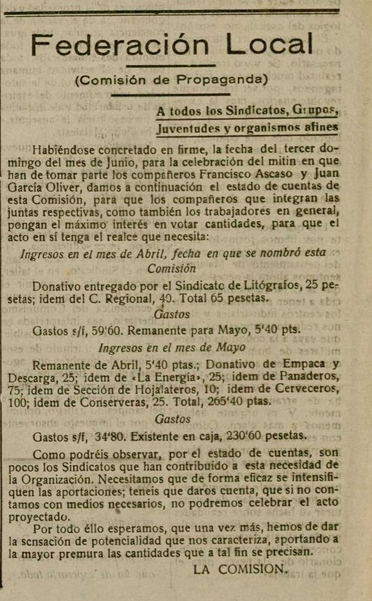 Das notas da Comisión de Propaganda coñecemos as aportacións dos diferentes sindicatos, seccións e outros entes confederais (as cantidades aportadas están expresadas en pesetas):