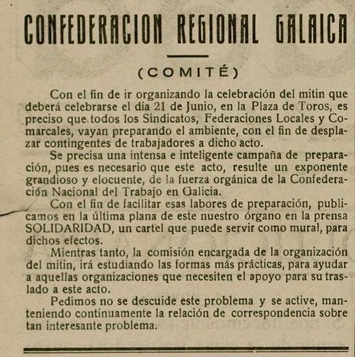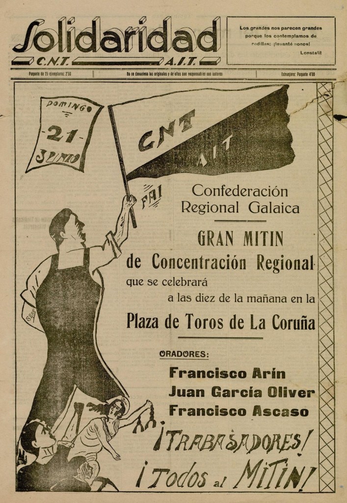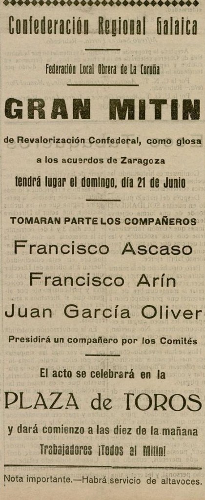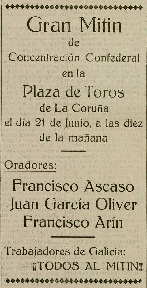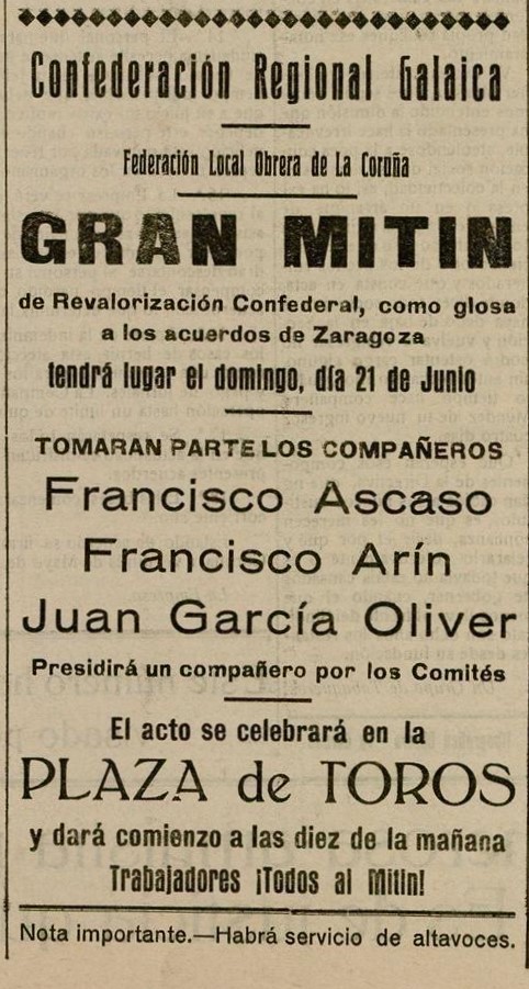 Na mañá do domingo 21 de xuño de 1936 tiña lugar na praza de touros da cidade da Coruña, un mitin anarcosindicalista, denominado de “Concentración Confederal” ou “de Revalorización Confederal, como glosa de los acuerdos de Zaragoza”, no que o principal orador foi o militante catalán Joan García Oliver.