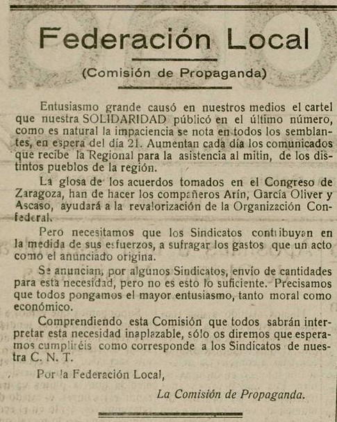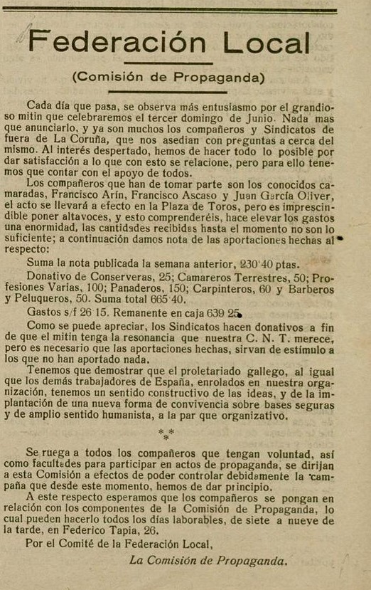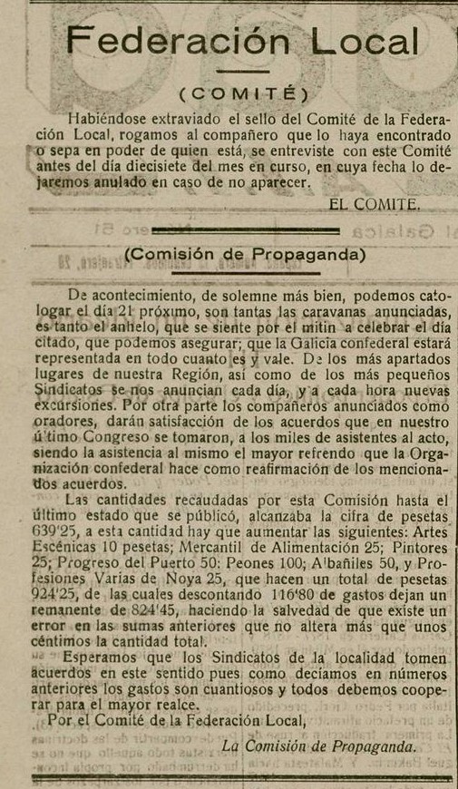 Nestas notas, a Comisión de Propaganda da FLO coruñesa solicita dos sindicatos a súa implicación na organización, realizando aportacións económicas das que logo se irá dando conta nas páxinas do semanario: