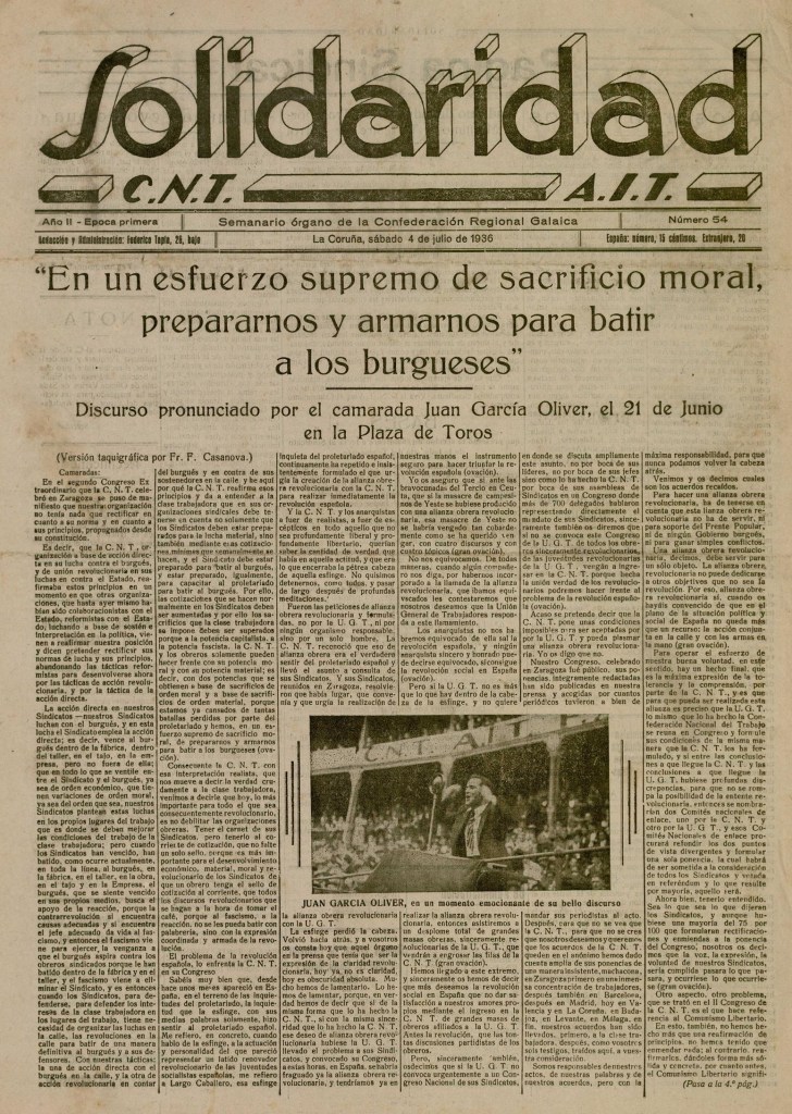 No número 54 deste semanario da CRG recóllese unha transcrición taquigráfica da intervención completa de Joan García Oliver, a cargo do compañeiro Francisco Fernández Casanova, do Sindicato de Gasistas e Electricistas “La Energía” da FLO da Coruña: