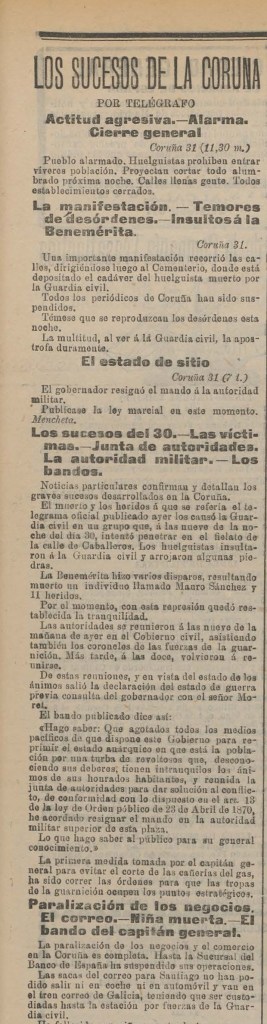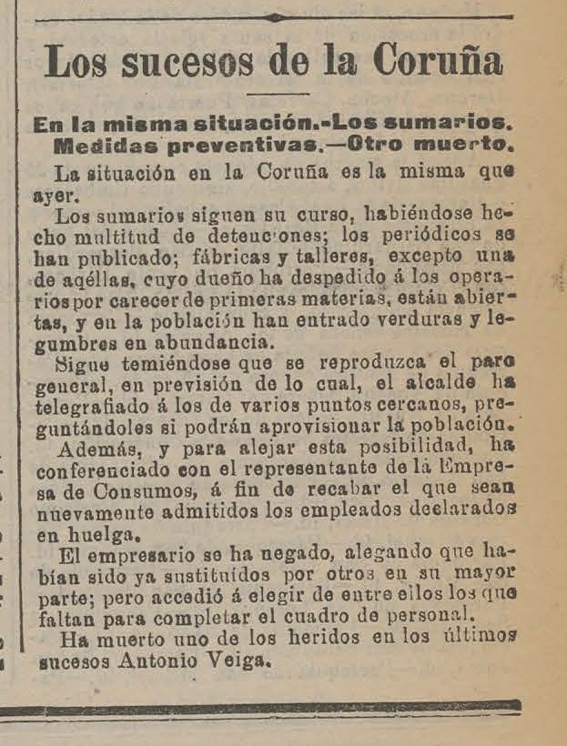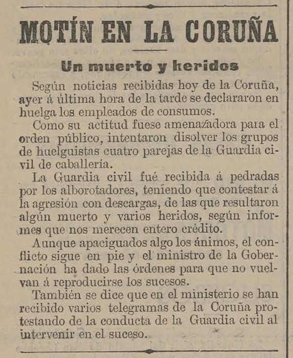 Xa no exemplar da tarde do 31 de maio de 1901 recolle na súa portada os sucesos na Coruña, cualificándoos de motín, para na páxina 3 facerse eco das novas de axencia asinadas pola Agencia Mencheta e enviadas aos medios por telégrafo.