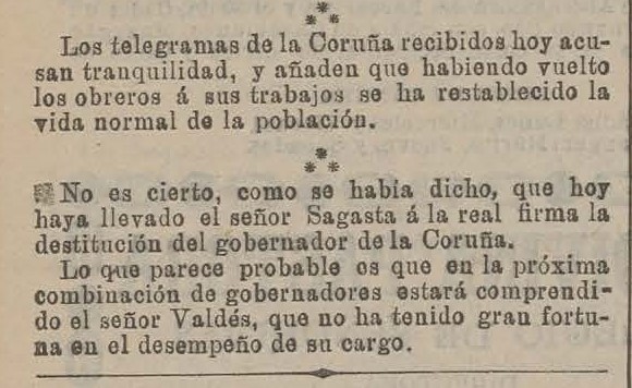 “Miren el señor Sagasta y el señor Moret el caso del gobernador de la Coruña. Pocos ejemplos de ineptitud como ese. Desde lejos se ve con claridad todo lo que ha omitido la autoridad civil ante el conflicto“.