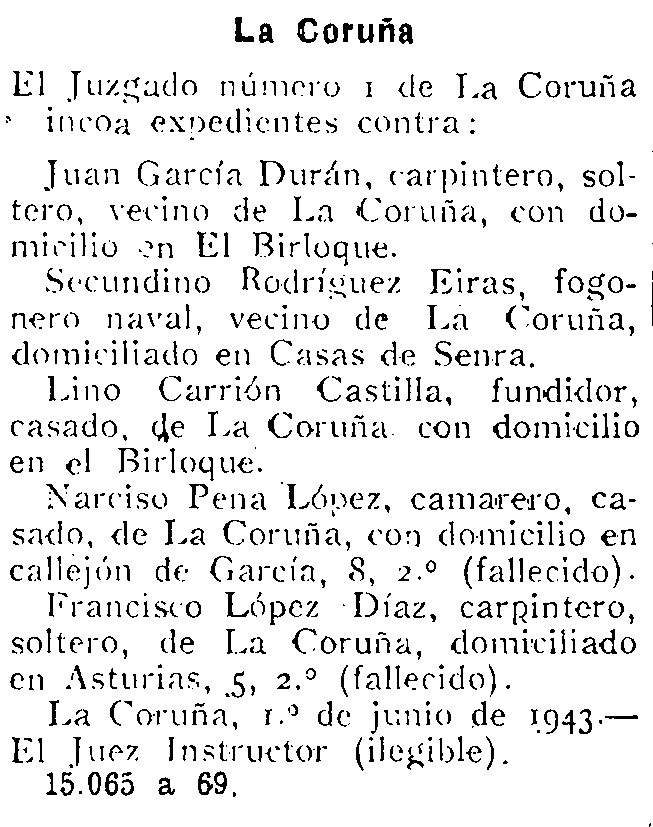 - Lino Carrión Castilla, metalúrxico, afiliado á CNT, natural de Valladolid e veciño, como dixemos, do barrio do Birloque na Coruña.