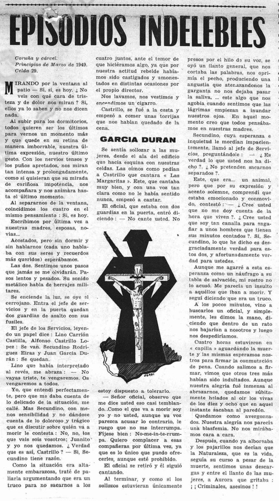Anos despois, dende o exilio en Francia, Juan García Durán publica un artigo titulado “Episodios Indelebles”, na publicación España Libre, o voceiro da CNT de España (M.L.E.) no exilio francés. Neste artigo plasma as lembranzas daquela tráxica noite: