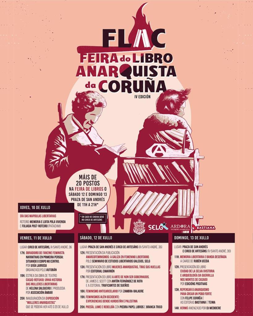Unha nova edición da Feira do Libro Anarquista da Coruña terá lugar do 11 ao 13 de xullo en diferentes puntos da contorna da rúa de Santo Andrés. Máis de 20 postos editoriais e unha manchea de actividades: presentacións, teatro, música… tomarán as rúas coruñesas coa forza da Idea.