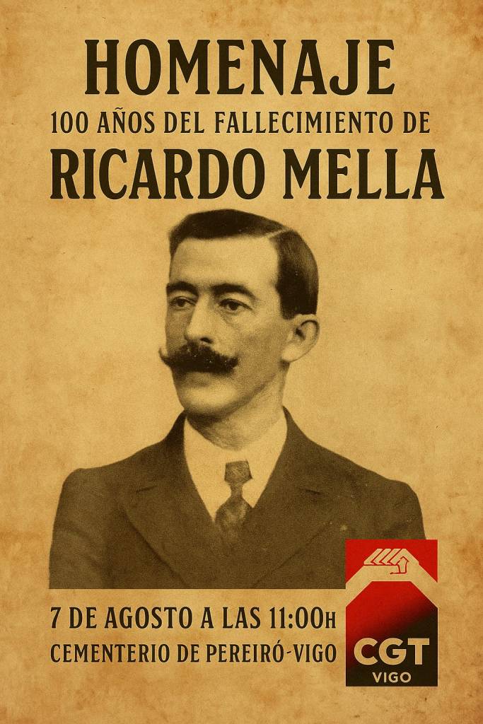 O vindeiro 7 de agosto de 2025, terá lugar un acto de homenaxe organizado pola CGT de Vigo con motivo do centenario do pasamento de Ricardo Mella.