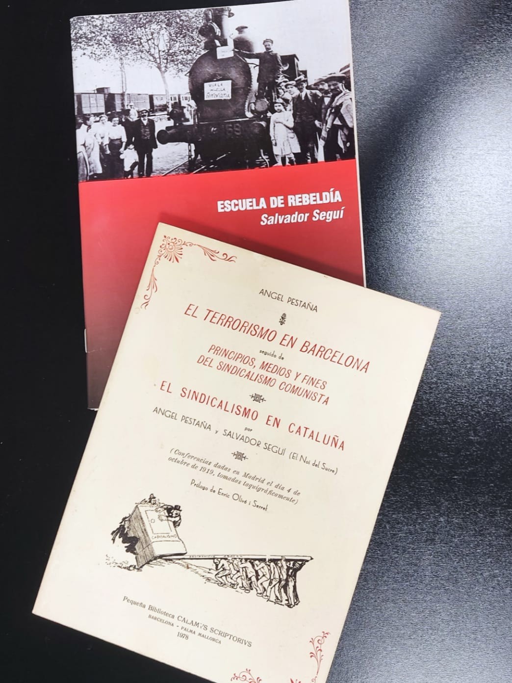 “El sindicalismo en Cataluña”, por Ángel Pestaña e Salvador Seguí. Reúne os textos de dúas conferencias impartidas en Madrid, o día 4 de outubro de 1919, que foron tomados taquigráficamente. Conta ademáis cun prólogo a cargo de Enric Olivé i Serret, e contén o texto da conferencia “El terrorismo en Barcelona”, de Angel Pestaña, seguido de Principios, Medios y Fines del Sindicalismo Comunista. Este libro pertence á Pequeña Biblioteca Calam’s Scriptorius. Foi editada en Barcelona e Palma de Mallorca, en 1978
