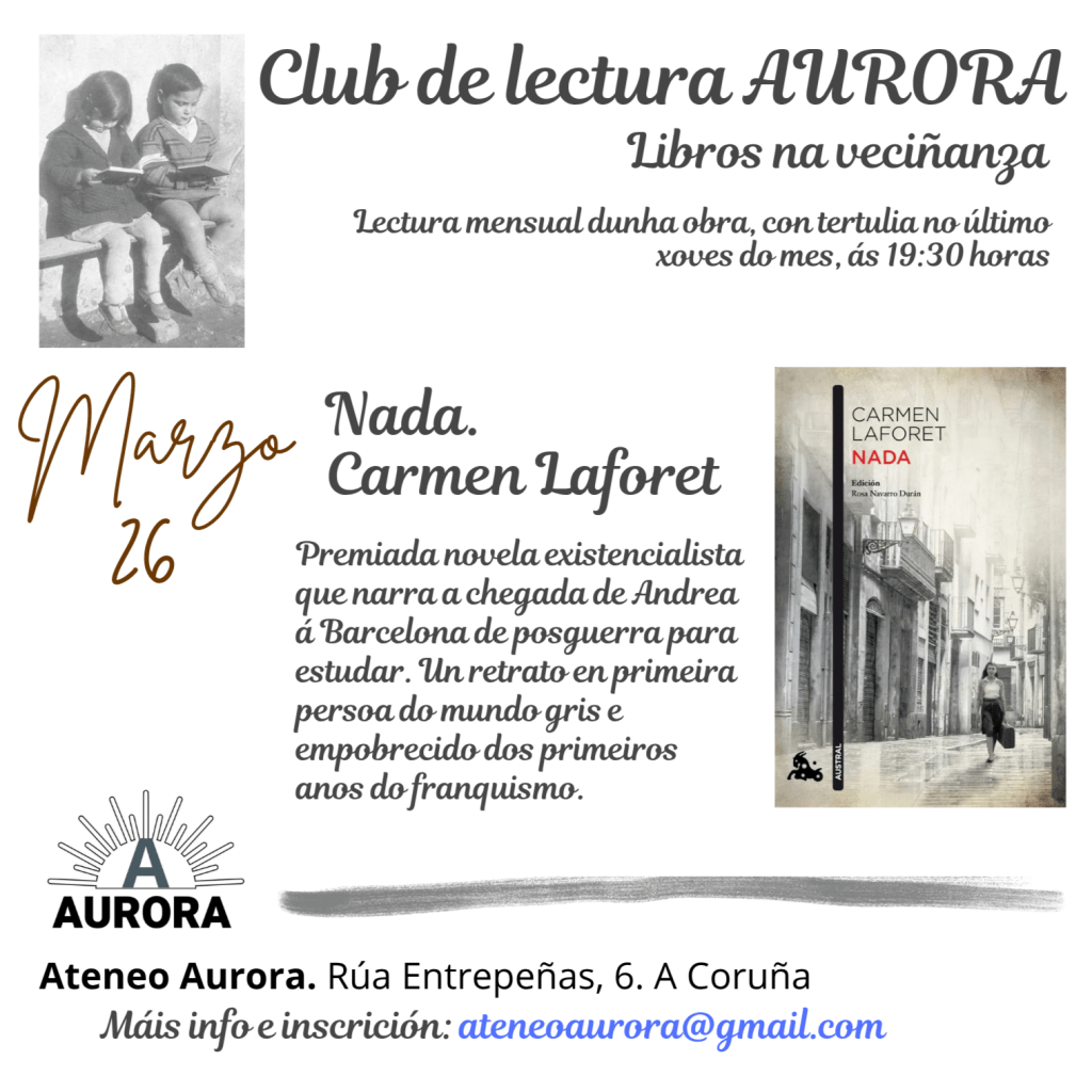 Lembrade que o vindeiro xoves, 26 de marzo, ás 19:30 temos a primeira tertulia do noso Club de lectura AURORA – Lecturas na veciñanza, coa novela Nada, obra de Carmen Laforet.
