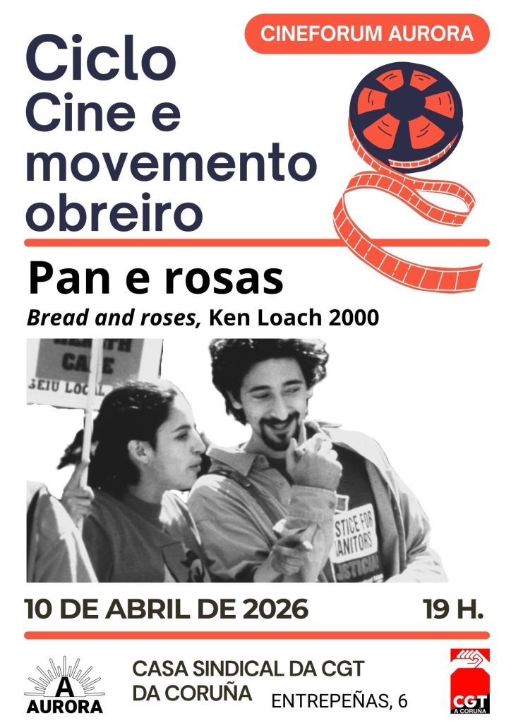 O vindeiro venres, 10 de abril de 2026, temos unha nova cita no Cineforum Aurora, no marco do ciclo titulado “Cine e movemento obreiro”, coa proxección do filme Pan e rosas, dirixido por Ken Loach no ano 2000.