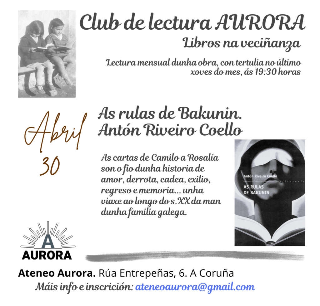 O vindeiro xoves, 30 de abril, ás 19:30 horas, temos a segunda tertulia do noso Club de lectura AURORA – Lecturas na veciñanza, coa novela As Rulas de Bakunin de Antón Riveiro Coello.